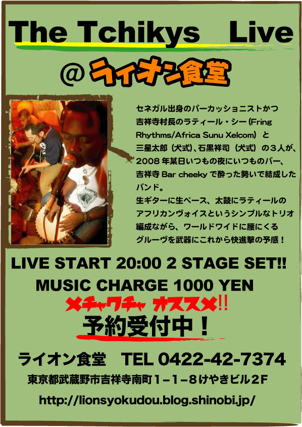出演アーティストは吉祥寺村長ことLATYR SY率いるThe Tchiky's!!!